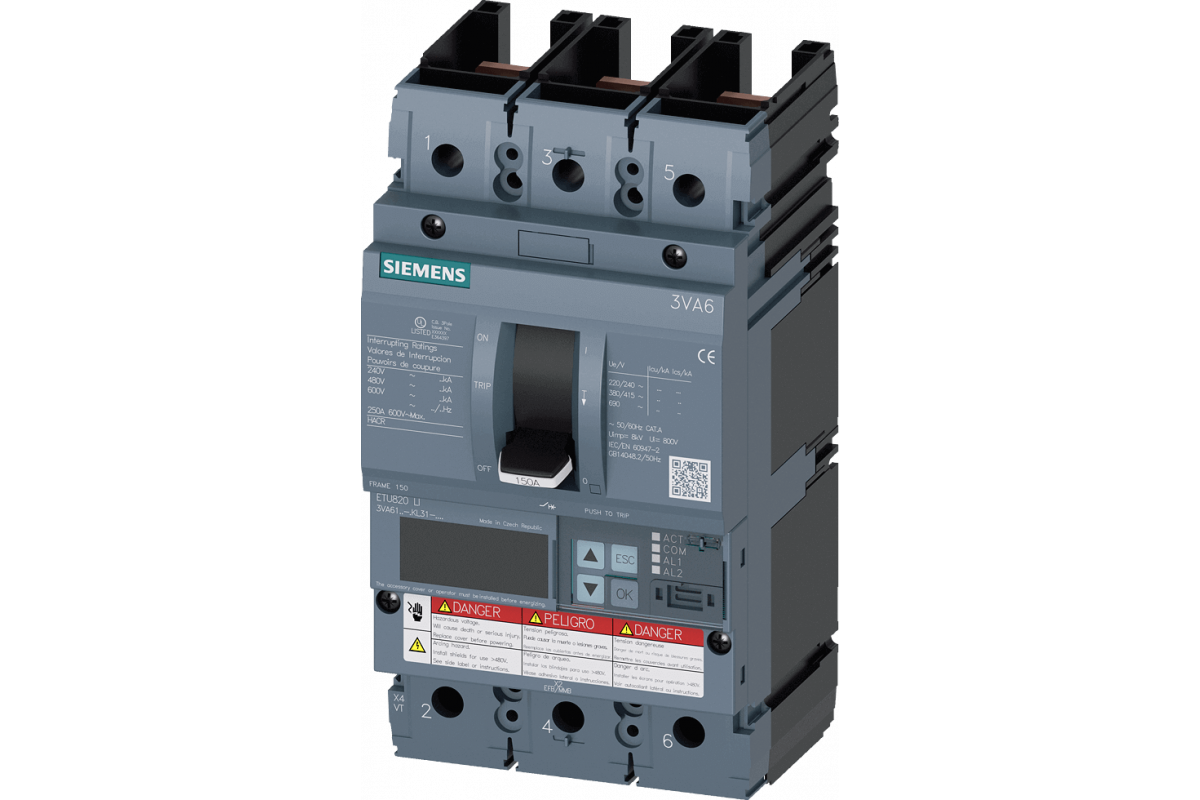 автоматический выключатель 3VA6 UL рамка 150 отключающая способность класс C 100kA @ 480V 3-полюсный, защита линии ETU820, LI, In=100A защита от перегрузки Ir=40A...100A защита от короткого замыкания Ii=1.5...12 x В без подключения
