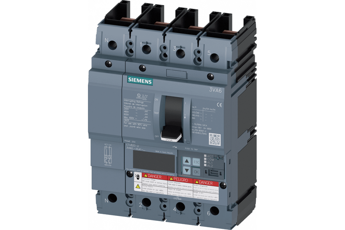 Автоматический выключатель 3VA6 UL рамка 250 отключающая способность класс M 35кА @ 480В 4 полюса, защита линии ETU820, LI, In=100A защита от перегрузки, 100% номинал Ir=40A...100A Защита от короткого замыкания Ii=1.5...12 x In без подключения