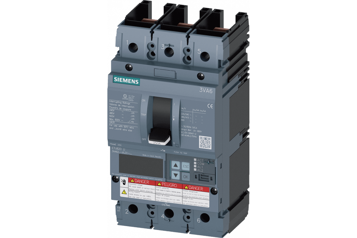 Автоматический выключатель 3VA6 UL frame 250 breaking capacity class H 65kA @ 480V 3-pole, line protection ETU820, li, In=100A overload protection ir=40A ...100A short circuit protection iI=1,5...12 x In w/o connection