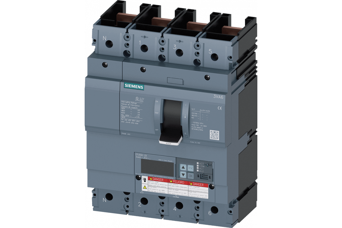 Автоматический выключатель 3VA6 UL frame 400 breaking capacity class M 35kA @ 480V 4-pole, line protection ETU550, LSI, In=250A overload protection ir=100A ...250A short circuit protection Isd=0,6..10x In, iI=1,5..12x In neutral protection adjustable (off, upto 160%) w/o connection