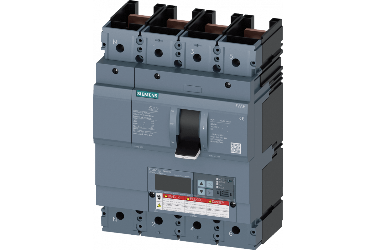 Автоматический выключатель 3VA6 UL рамка 400 отключающая способность класс M 35kA @ 480V 4-полюсный, защита линии ETU856, LSI, In=250A защита от перегрузки, 100% номинальная Ir=100A...250A Защита от короткого замыкания Isd=0.6..10x In, Ii=1.5..12x In N защита проводников регулируемая (ВЫКЛ, до 160%) Сигнал о замыкании на землю через EFB300 или COM без подключения