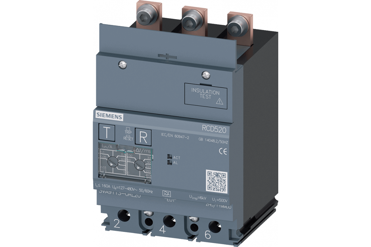 Устройство защитного отключения RCD520 Базовое УЗО типа A со стороны нагрузки номинальный остаток. ток 0.03...5А при 50/60Гц регулируемый тв 0...3000 мс 3-полюсное In=160A Ue=100-480В принадлежность для: 3VA1