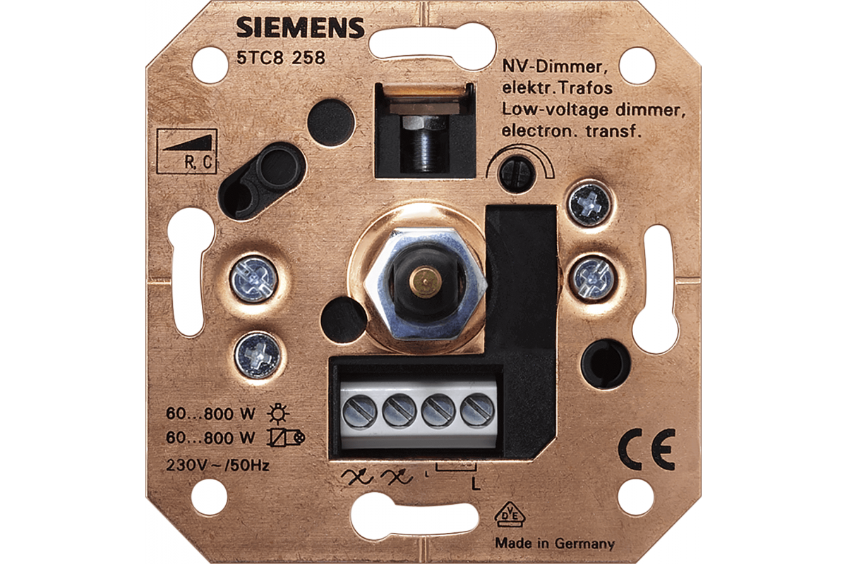 NV диммер для электронных трансформаторов, R, C с кнопочным/селекторным переключателем ON/OFF FM, 230В 50-60Гц, 60-800 Вт/ВА для когтевого и Винтовой монтаж Винтовые клеммы
