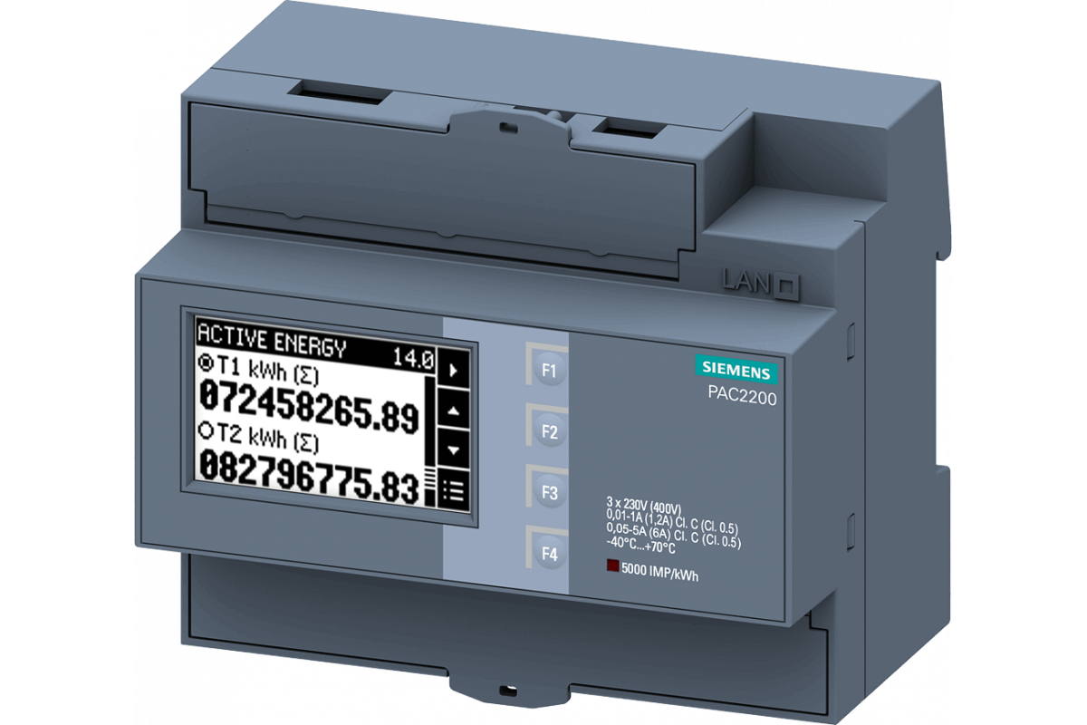 SENTRON, измерительный прибор, 7KM PAC2200, светодиод, L-L: 400 В, L-N: 230 В, 5 A, устройство для DIN-рейки, 3-фазн., Modbus RTU, полная / активная/ реактивная энергия, с автономным питанием, винтовой зажим