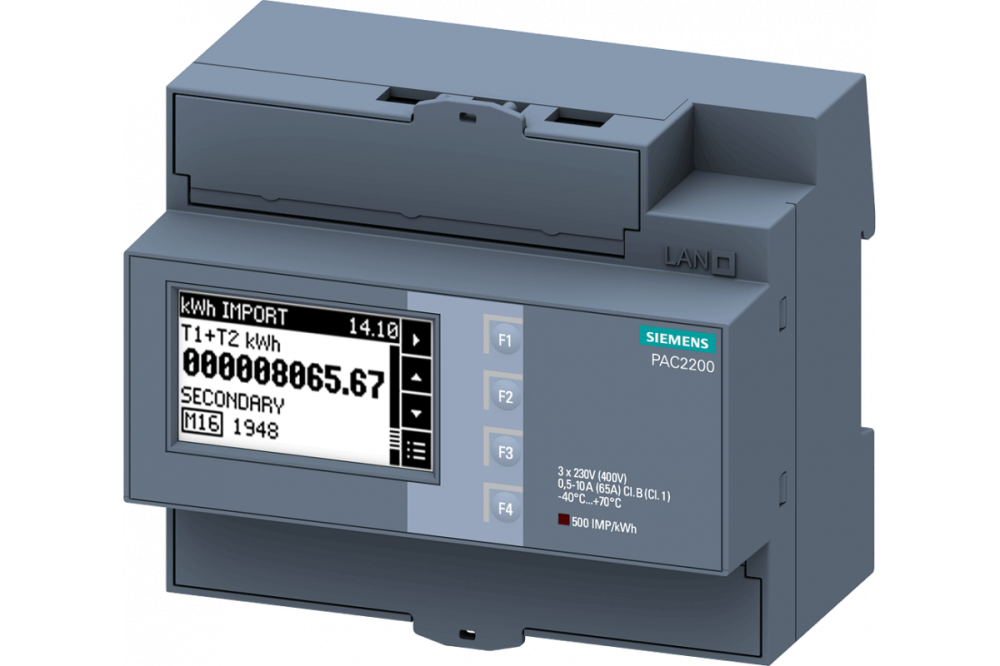 SENTRON, измерительный прибор, 7KM PAC2200, светодиод, L-L: 400 В, L-N: 230 В, 65 A, устройство для DIN-рейки, 3-фазн., шина M + MID, полная / активная/ реактивная энергия, с автономным питанием, винтовой зажим
