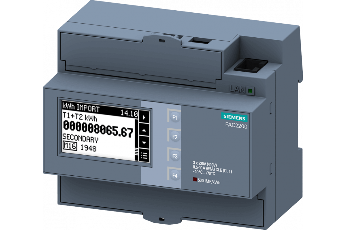 SENTRON, измерительный прибор, 7KM PAC2200, светодиод, L-L: 400 В, L-N: 230 В, 65 A, устройство для DIN-рейки, 3-фазн., Modbus TCP + MID, полная/ активная/ реактивная энергия, с автономным питанием, винтовой зажим