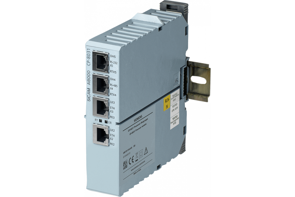 SICAM A8000 CP-8031 - ведущий модуль, поддерживающий 2x RJ45 Ethernet и 2x последовательных интерфейса. Требуется источник питания PS-862x или PS-864x. Поддерживается одиночное или резервное питание. До 8 модулей ввода/вывода SICAM A8000 могут быть подключены прямо рядом с источником питания.