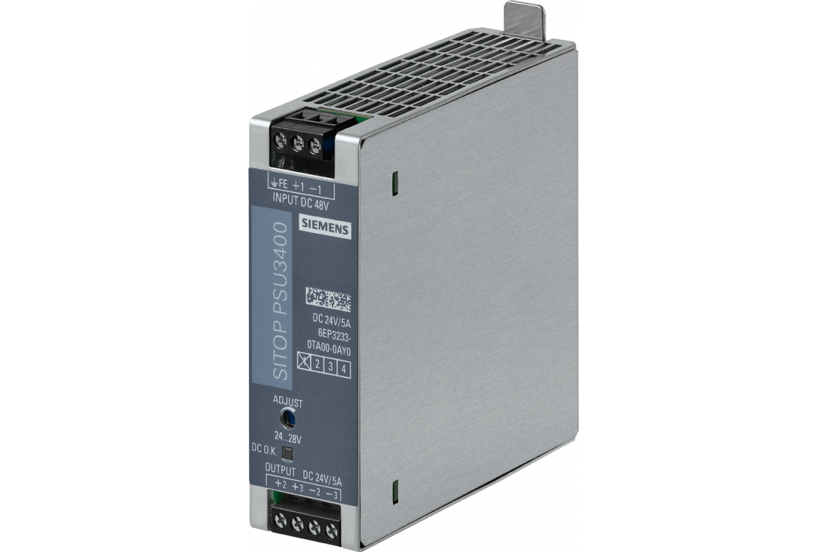 SITOP PSU3400 24 В/5 А стабилизированный источник питания Вход: 48 В постоянного тока (28...60 В) Выход: 24 В ПОСТОЯННОГО ТОКА/5 A