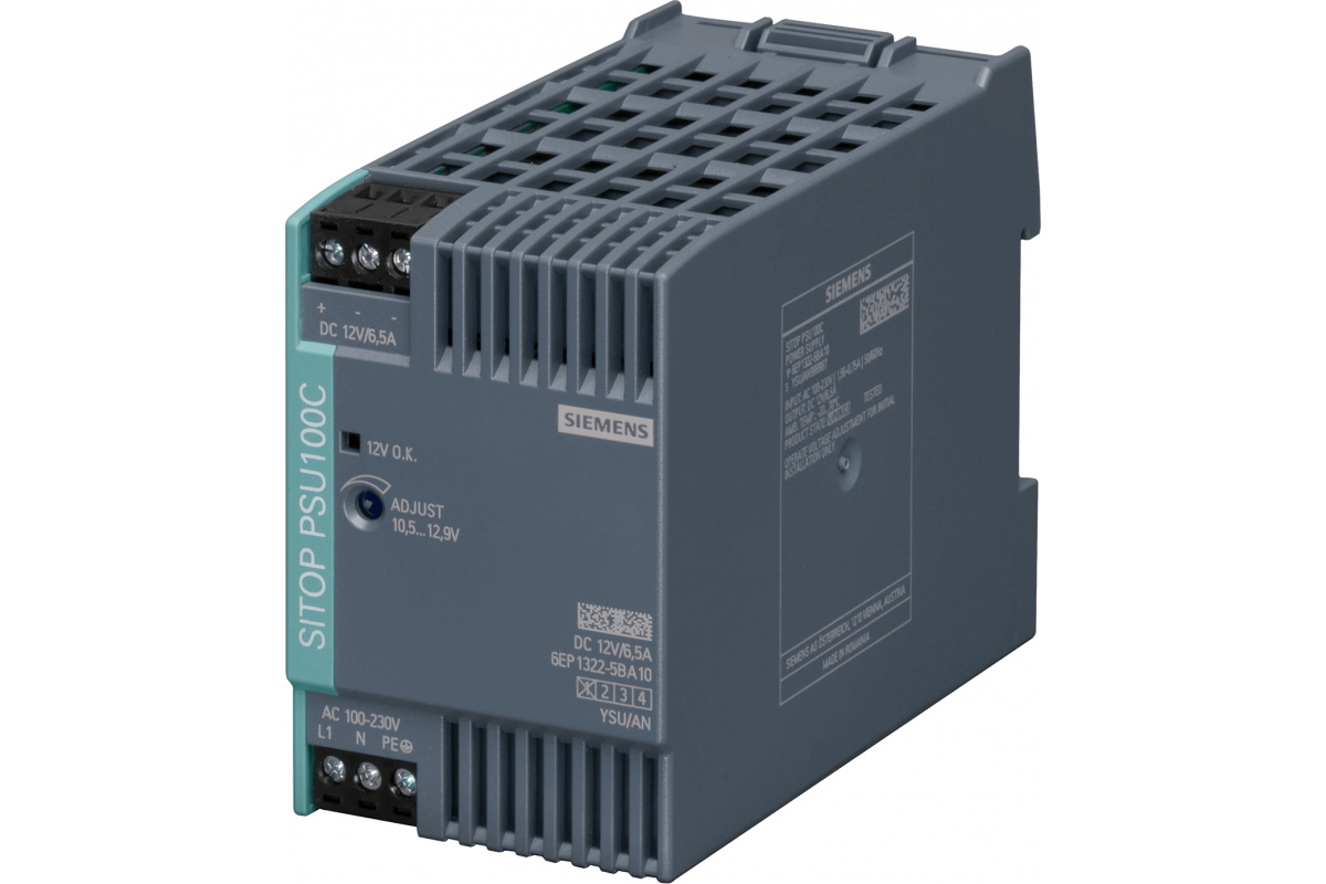 Компактный блок питания PSU100C с входным напряжением постоянного 100…300В DC или переменного 85…264B AC тока, выходным напряжением 12В DC и токами нагрузки 6,5 А. Блоки питания позволяют настраивать необходимый уровень выходного напряжения. Компактные блоки питания SITOP Compact обладают высокой эффективностью, сохраняют работоспособность в диапазоне температур от -20 до +70°C.