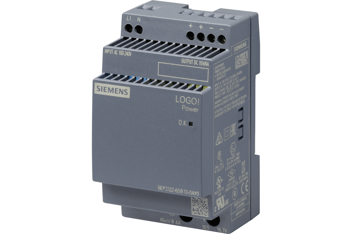 LOGO!power 15 v / 4 a, стабилизированный блок питания, вход: ~100-240 в, выход: =15 В / 4 aЛогические модули LOGO!, SIPLUS LOGO!, LOGO! Power, SITOP PSA 6EP3322-6SB10-0AY0