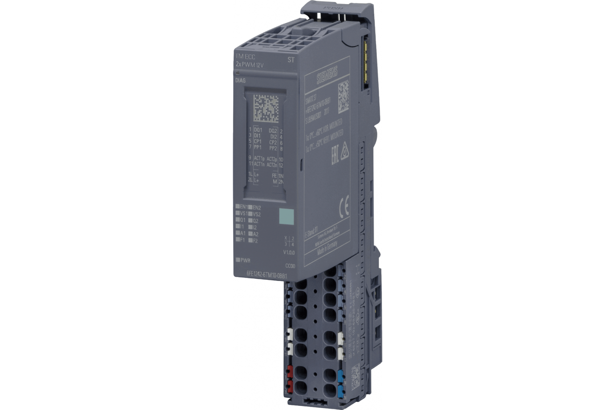 SIMATIC ET 200SP TM ECC 2xPWM ST Контроллер заряда f. кондуктивная зарядка электромобилей в соответствии с IEC61851 режим 3 для 2 пунктов зарядки -30°C...60°C 2x Control Pilot 2x Plug Present 2x DQ переключающий контакт для контактора; 2x DI считывающий контакт для контактора или блокировки разъема; 2x ACT для блокировки разъема подходит для BU Typ BU20-P12+A0+4B и BU20-P12+A4+0B