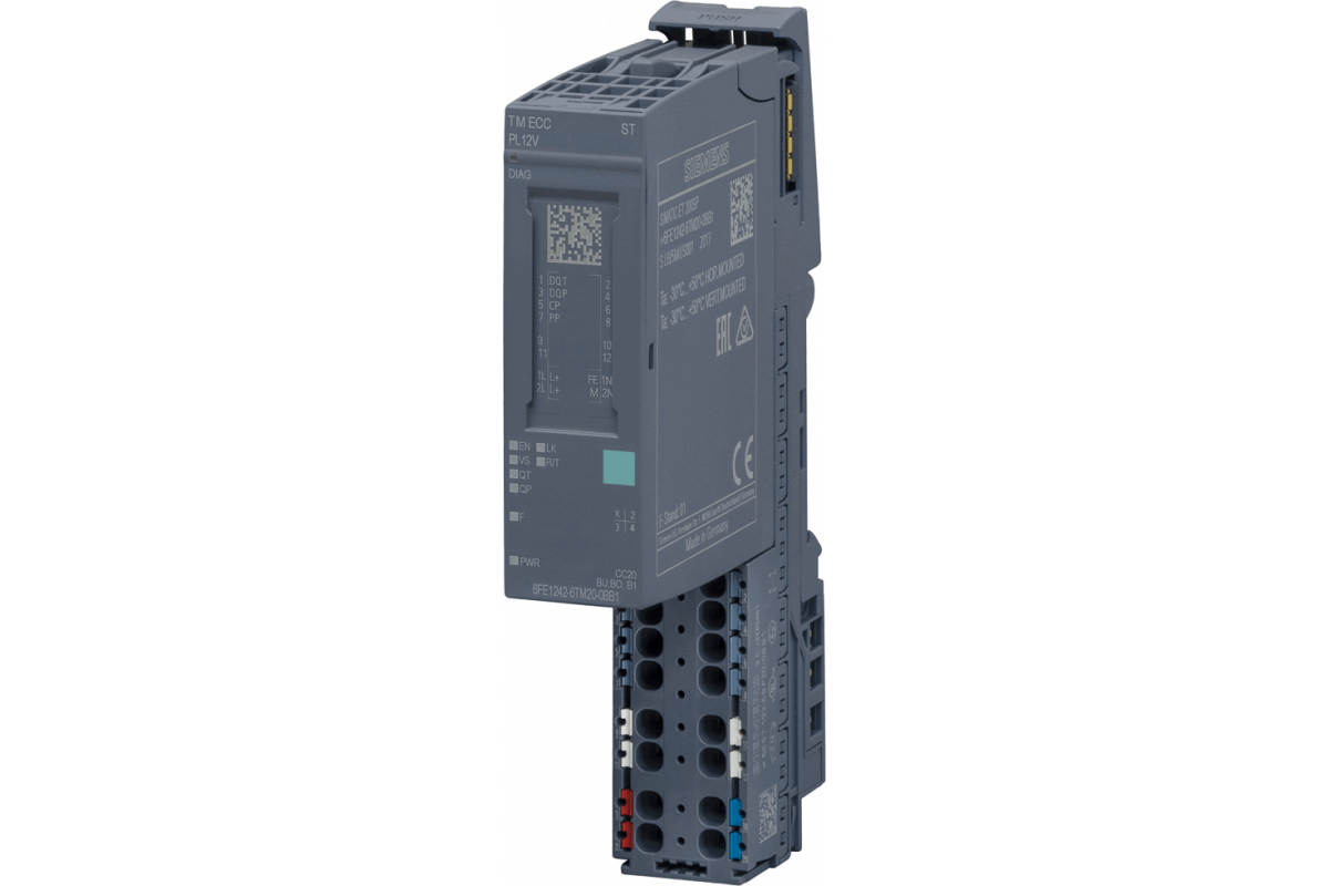 SIMATIC ET 200SP, технологический модуль TM ECC PL ST, контроллер зарядки для электромобилей, зарядка электромобилей в соответствии с DIN SPEC 70121, режим 4, темп.:-30°C...60°C 1x выход Control Pilot включая вилку Powerline Green Phy, 1x канал наличия/близости штекера, 1x дискретный выход с открытым коллектором для TRIP-функции, 1 x дискретный выход Out (DQ P) , для установки на базовый блок BU типа BU20-P12+A0+4B или BU20-P12+A4+0B