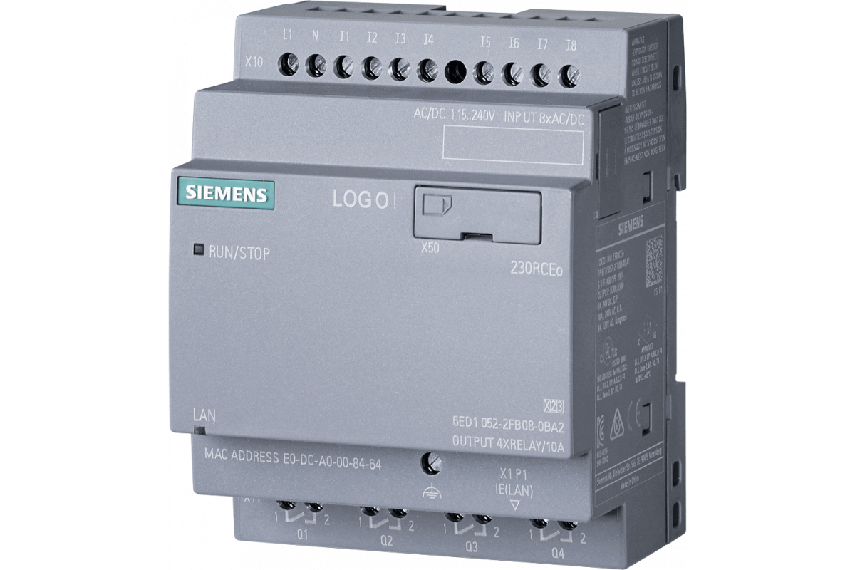 SIPLUS LOGO! 230RCEO на базе 6ED1052-2FB08-0BA2 с конформным покрытием -40...+70 °C запуск -25 °C, питание логического модуля / ввод/вывод: 115 В/230 В/реле 8 цифровых входов/4 цифровых выхода, без памяти дисплея 400 блоков, модульное расширение, встроенный веб-сервер Ethernet, журнал данных, определяемые пользователем веб-страницы, стандартная карта microSD для LOGO! Soft Comfort V8,4 или выше, старые проекты, исполняемые через облачное соединение, MQTT во всех LOGO! 8,4 базовый блок