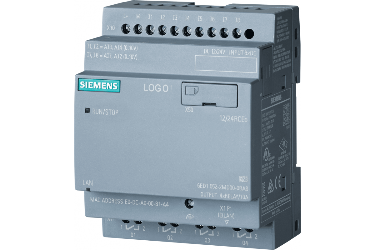 SIPLUS LOGO! 12/24RCEO на базе 6ED1052-2MD08-0BA1 с конформным покрытием, -40...+70 °C, запуск -25 °C, логический модуль, питание/вход/выход: 12/24 В DC/реле, 8 DI (4 AI)/4 DQ, без дисплея память 400 блоков, модульно расширяемая, Ethernet, встроенный веб-сервер, журнал данных, пользовательские веб-страницы, стандартная карта microSD для LOGO! Soft Comfort V8.3 или более старые проекты исполняемое облачное соединение во всех LOGO! 8.3 базовые единицы