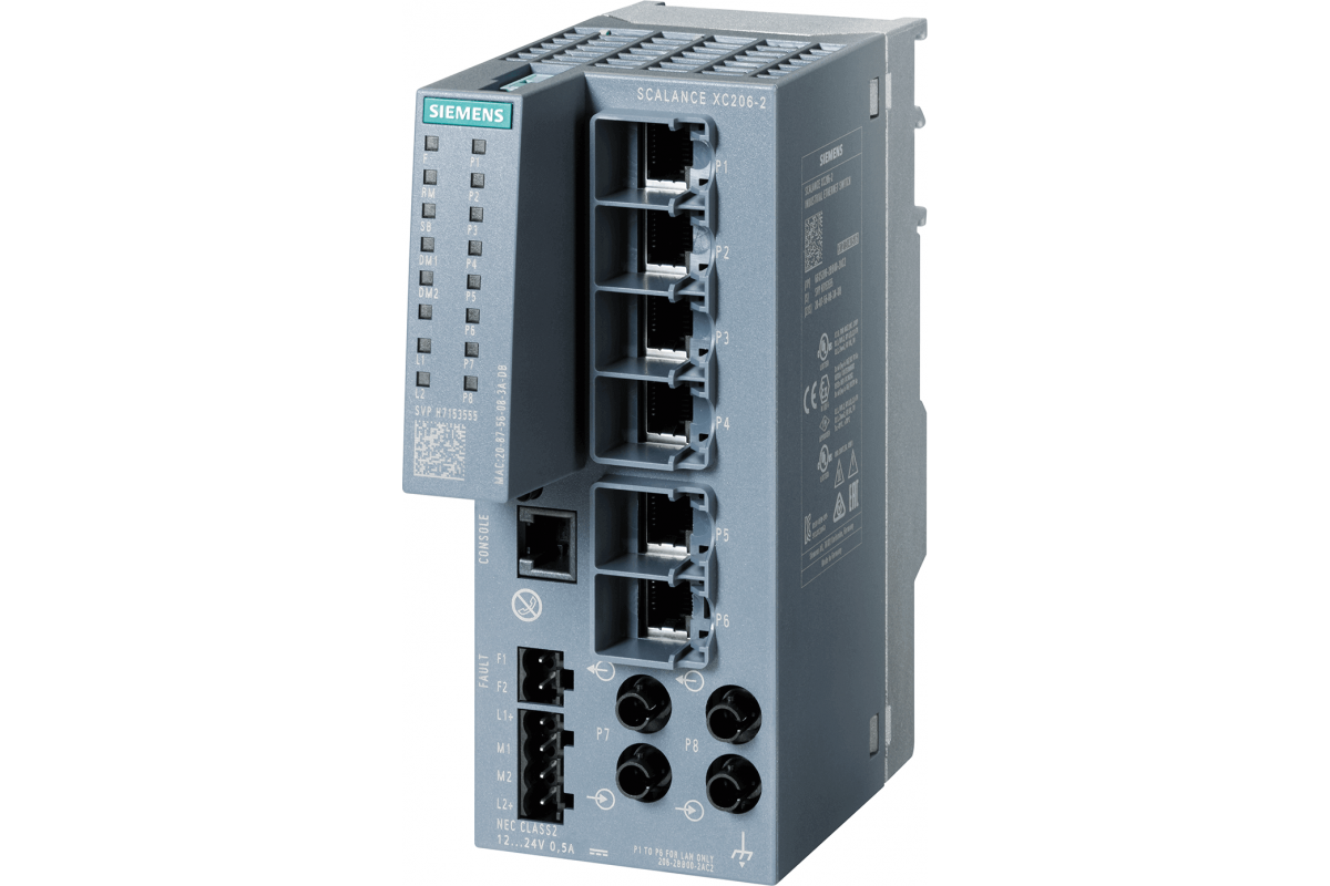 SIPLUS NET SCALANCE XC206-2 на базе 6GK5206-2BB00-2AC2 с конформным покрытием, -40...+70 °C, управляемый коммутатор уровня 2 IE; 6 портов RJ45 100 Мбит/с; 2 порта ST/BFOC 100 Мбит/с; 1 порт консоли; диагностические светодиоды резервный источник питания диапазон температур -40 °C до +70 °C; монтаж: DIN-рейка/S7 монтажная рейка/стена функции резервирования; офисные функции (RSTP, VLAN и др.); устройство PROFINET IO; Ethernet/IP-совместимый разъем C-Plug;