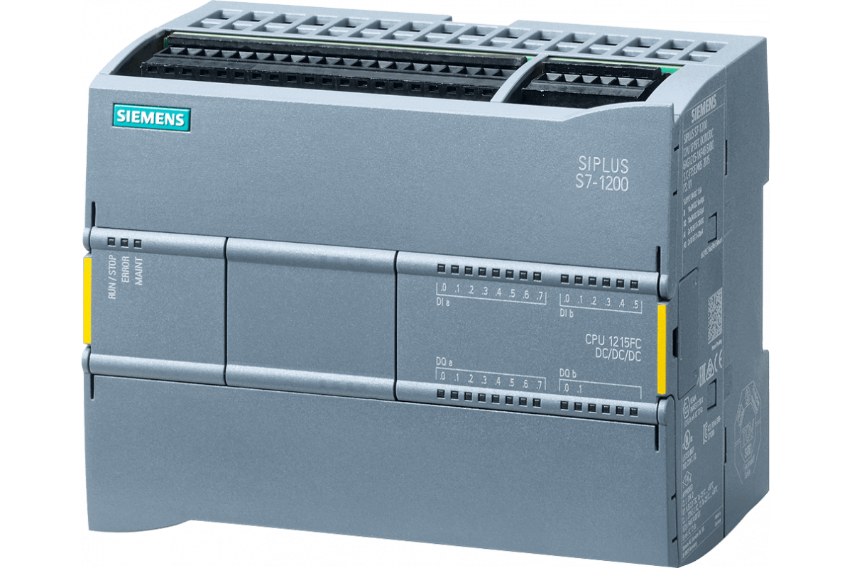 SIPLUS S7-1200 CPU 1215FC DC/DC/DC на базе 6ES7215-1AF40-0XB0 с конформным покрытием, -25...+55 °C, компактный CPU, DC/DC/DC, 2 порта PROFINET, встроенный ввод/вывод: 14 DI 24 В ПОСТ. ТОКА; 10 DQ 24 В ПОСТ. ТОКА 0.5 A; 2 AI 0-10 В DC, 2 AQ 0-20 мА DC, питание: DC 20.4 - 28.8 В постоянного тока, память программ/данных 150 КБ