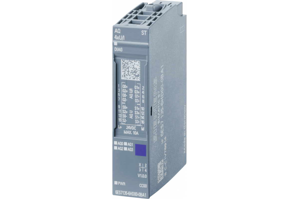 SIPLUS ET 200SP, модуль аналоговых выходов AQ 4XU/I ST TX RAIL, рабочая температура -40 ... +70°C, до +85°C в течение 10 минут, со стойким покрытием, на основе 6ES7135-6HD00-0BA1 . модуль аналоговых выходов (напражение/ток) AQ 4XU/I со стандартными функциями, для установки на базовый блок типа A0, A1, цветовой код CC00, диагностика модуля, 16 бит, +/-0,3%