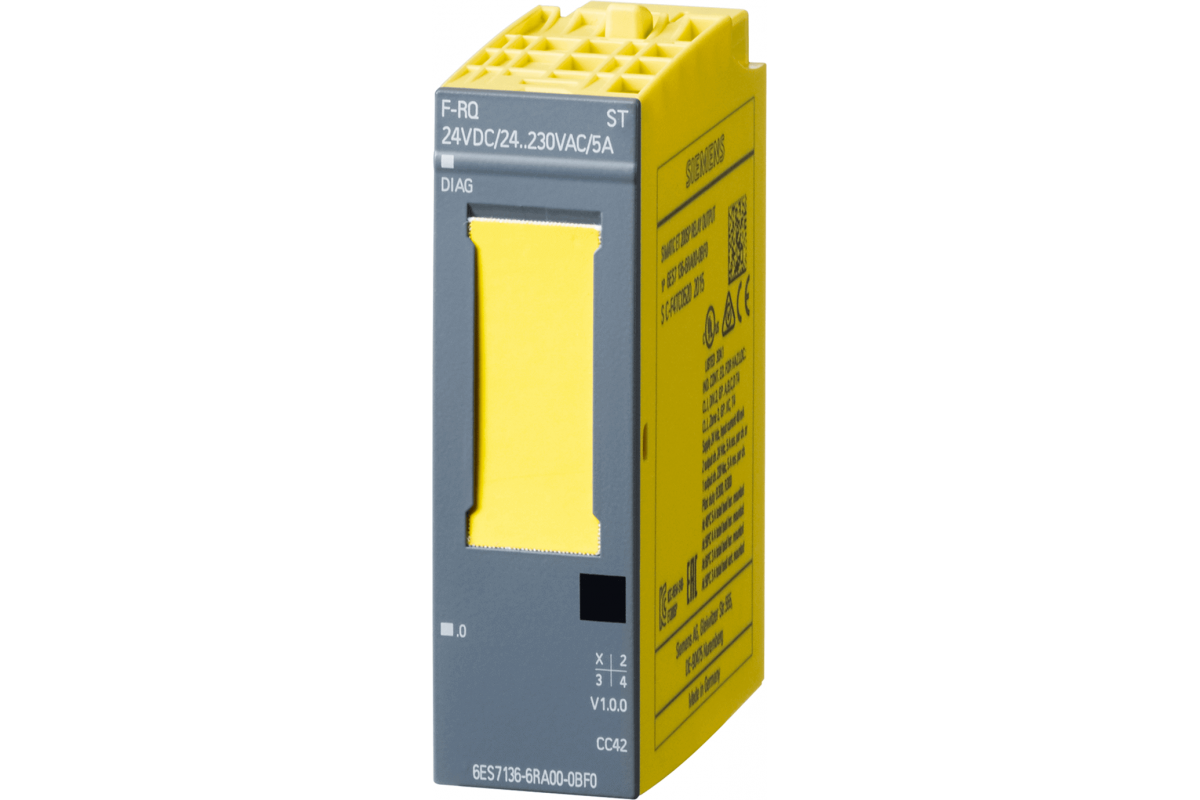 SIPLUS ET 200SP F-RQ 24VDC230VAC/5A шина на базе 6ES7136-6RA00-0BF0 с конформным покрытием, -30...+60 °C, OT1 с ST1/2 (+70 °C fur 10 минут), габаритная ширина 20 мм, 1 релейный выход (2 NO) суммарный выходной ток 5 A, напряжение нагрузки 24 В постоянного тока и 24 ... 230 В переменного тока, может использоваться до PL e (ISO 13849-1: 2008)/ SIL 3 (IEC 61508: 2010), если управляется F-DQ (e.g. 6AG2136-6DB00-1CA0)