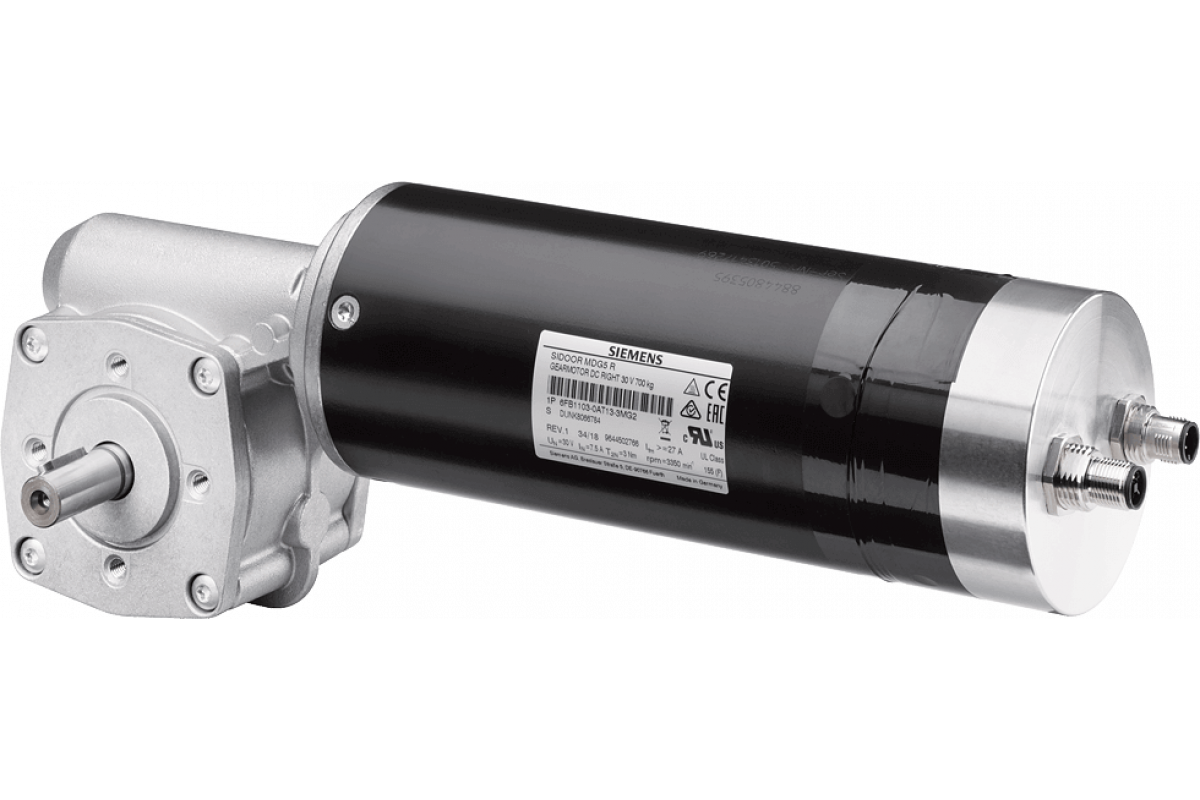Мотор-редуктор SIDOOR MDG5 R, вал справа с пазом и установленной шпонкой A5x5 по DIN 6885, макс. 700 кг перемещаемой массы, IP56, 2x M12 для отдельного кабеля подключения двигателя, 30 В постоянного тока, от -20 до +50 °C