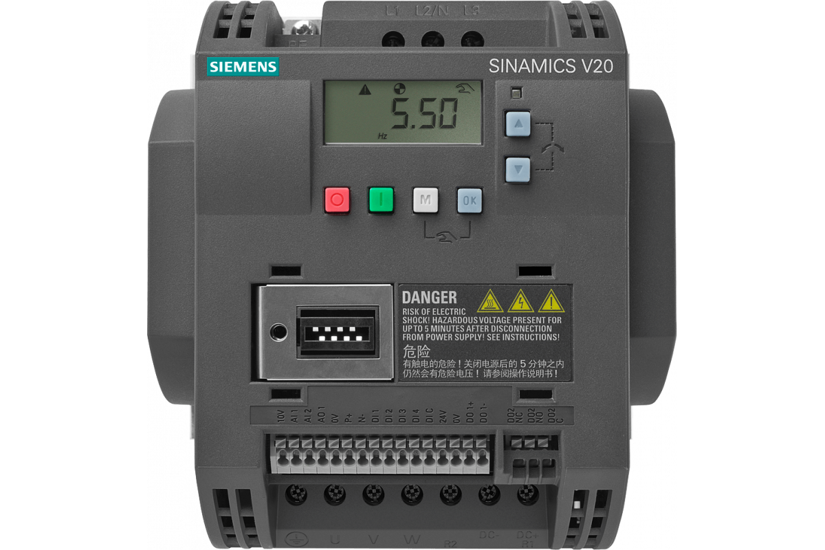 SINAMICS V20 380-480 В 3 AC -15/+10% 47-63 Гц номинальная мощность 0,75 кВт с перегрузкой 150% в течение 60 сек, нефильтрованный I/O: 4 DI, 2 DO, 2 AI, 1 AQ полевая шина: USS/MODBUS RTU со встроенным BOP защита: IP20/UL открытый размер: A 90x150x145,5 (ШxВxГ) со встроенным тормозным модулем