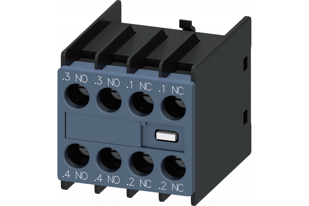вспомогательный выключатель, на передней панели, 2 НО + 2 НЗ, .3/.4, .3/.4, .1/.2, .1/.2, путь тока: 1 НО, 1 НО, 1 НЗ, 1 НЗ, 1 НЗ, винтовая клемма, для контакторов 3RT2 и контакторных реле 3RH2