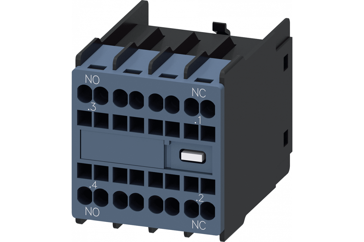 вспомогательный выключатель, совместимый с полупроводниковыми приборами, на передней панели, 1 НО + 1 НЗ, .3/.4, --/--, --/--, .1/.2, путь тока: 1 НО (совместимый с твердым телом), --, --, --, 1 НЗ (совместимый с твердым телом), подпружиненная клемма, для контакторов 3RT2 и контакторных реле 3RH2