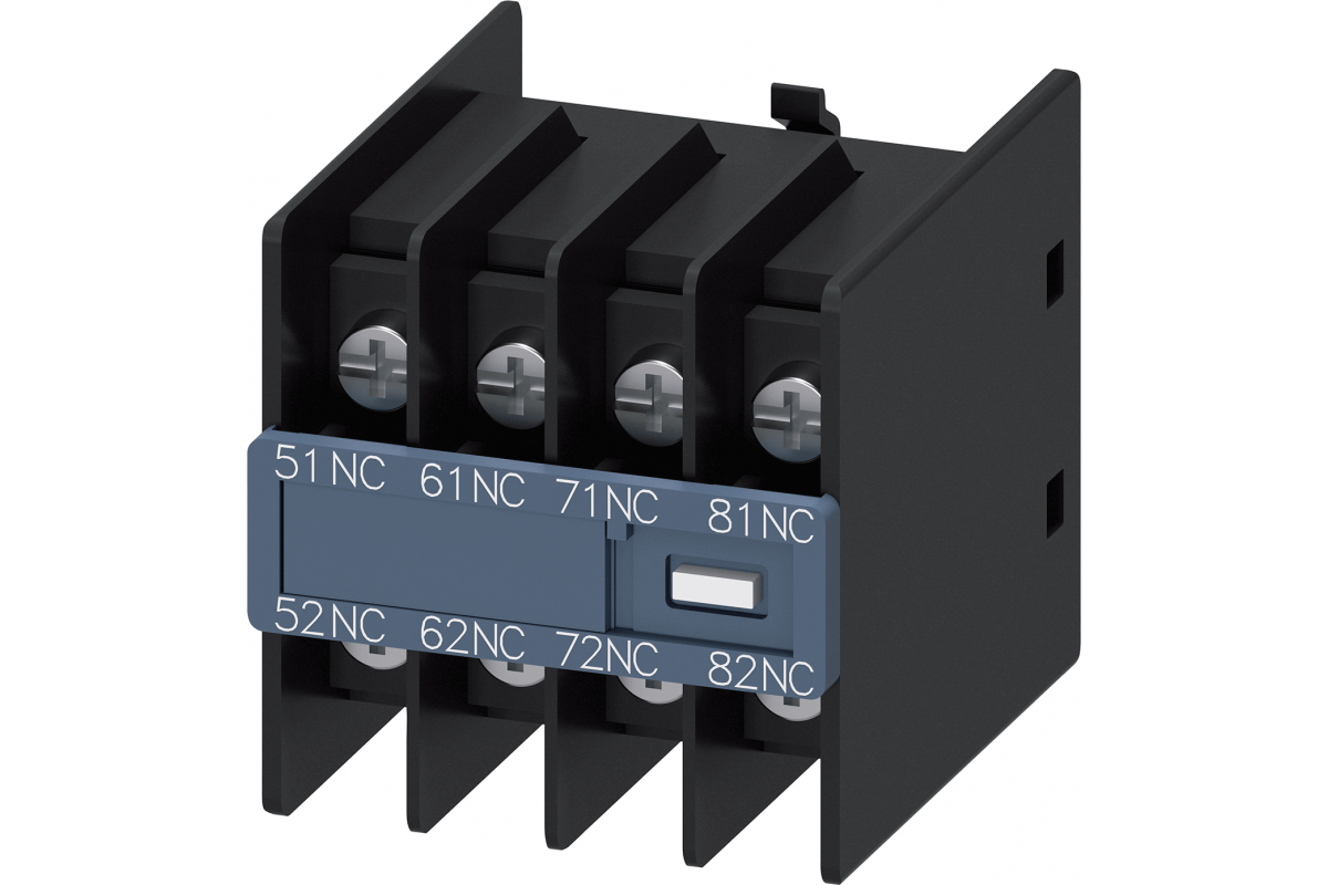 вспомогательный выключатель, на передней панели, 4 НЗ, 51/52, 61/62, 71/72, 81/82, путь тока: 1 НЗ, 1 НЗ, 1 НЗ, 1 НЗ, подключение с помощью кольцевого кабельного наконечника, физически кодированный, только с контакторными реле 3RH2140 и 3RH2440 в комбинации (согласно EN 50011)