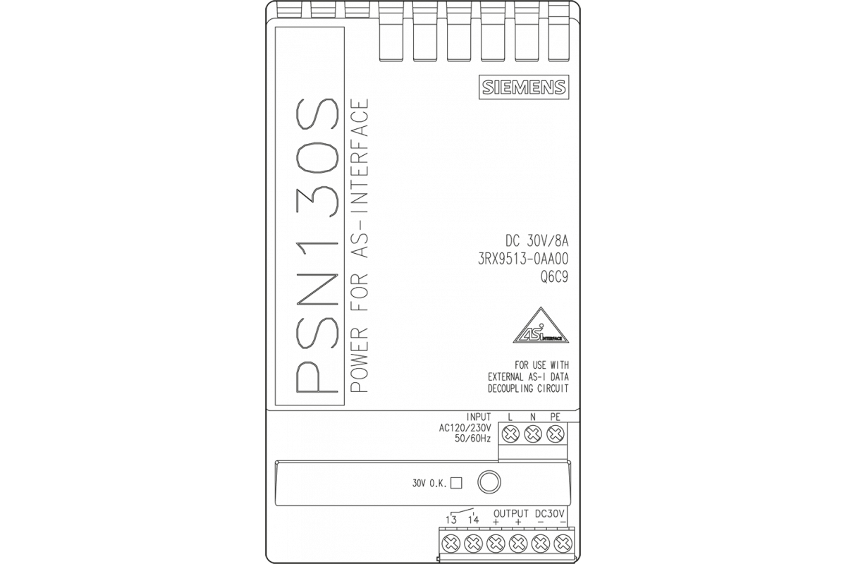 PSN130S 8 A 120 В/230 В AC IP20 Блок питания 30 В, для AS-i без развязки данных AS-i IN: 120 В / 230 В AC OUT: 30 В DC, 8 A, IP20 со встроенной системой обнаружения перегрузки с сигнальным контактом