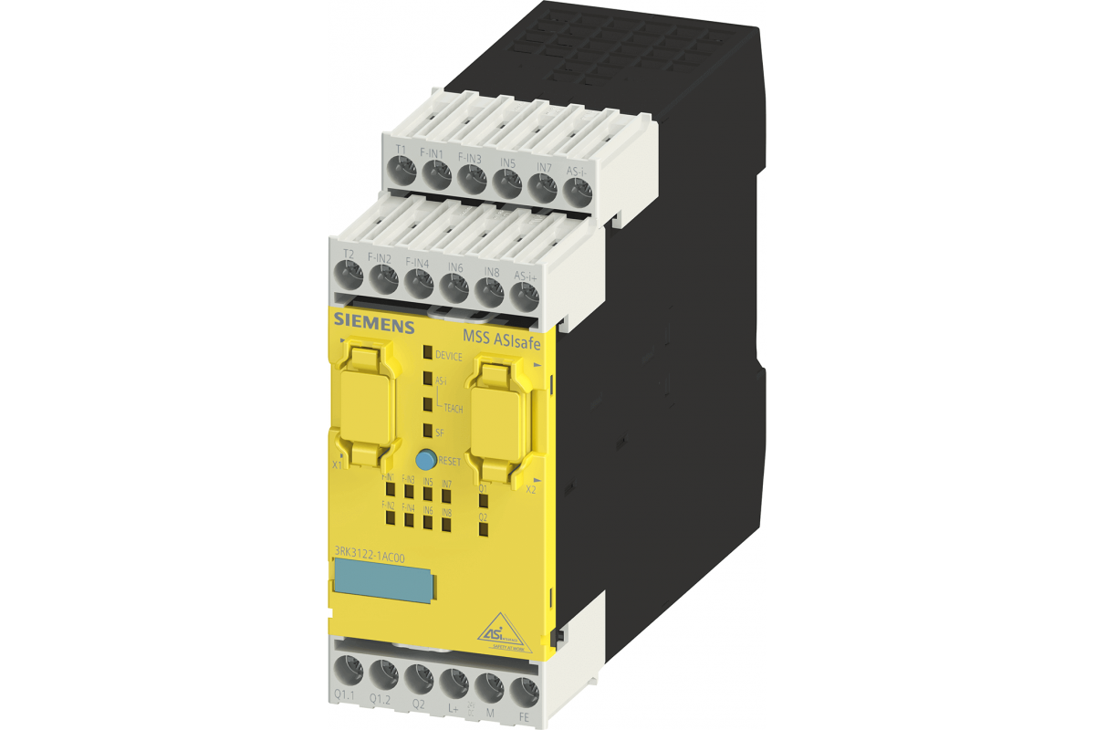 SIRIUS, Центральный блок 3RK3 ASIsafe Расширенный для модульной системы безопасности 3RK3 2/4 F-DI, 4 DI, 1 F-RO, 1 F-DO, 24 В DC Контроль ведомых устройств ASI Управление 10 безопасными выходами на шине AS-Interface Параметрируемый с помощью программного обеспечения Винтовая клемма Safety ES шириной 45 мм До SIL3 (IEC 61508) До уровня эффективности E (ISO 13849-1) 2 подключаемых модуля расширения