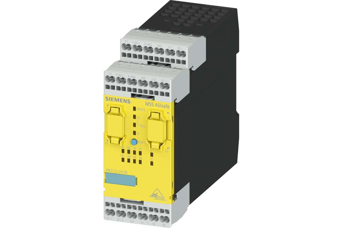 SIRIUS, CENTRAL UNIT 3RK3 ASISAFE EXTENDED ДЛЯ MODULAR SAFETY SYSTEM 3RK3 2/4F-DI,4DI, 1F-RO,1F-DO,24V DC MONITORING OF ASI SLAVES, CONTROL OF 10 SAFE OUTPUTS ON AS-I BUS PARAMETERIZABLE VIA SW MSS ES WIDTH 45MM SPRING-LOADED TERMINAL UP TO CATEGORY 4 (EN954-1) UP TO SIL3 (IEC 61508) UP TO PERFORMANCE LEVEL E (ISO 13849-1) 2 EXPANSION MODULES CAN BE CONNECTED