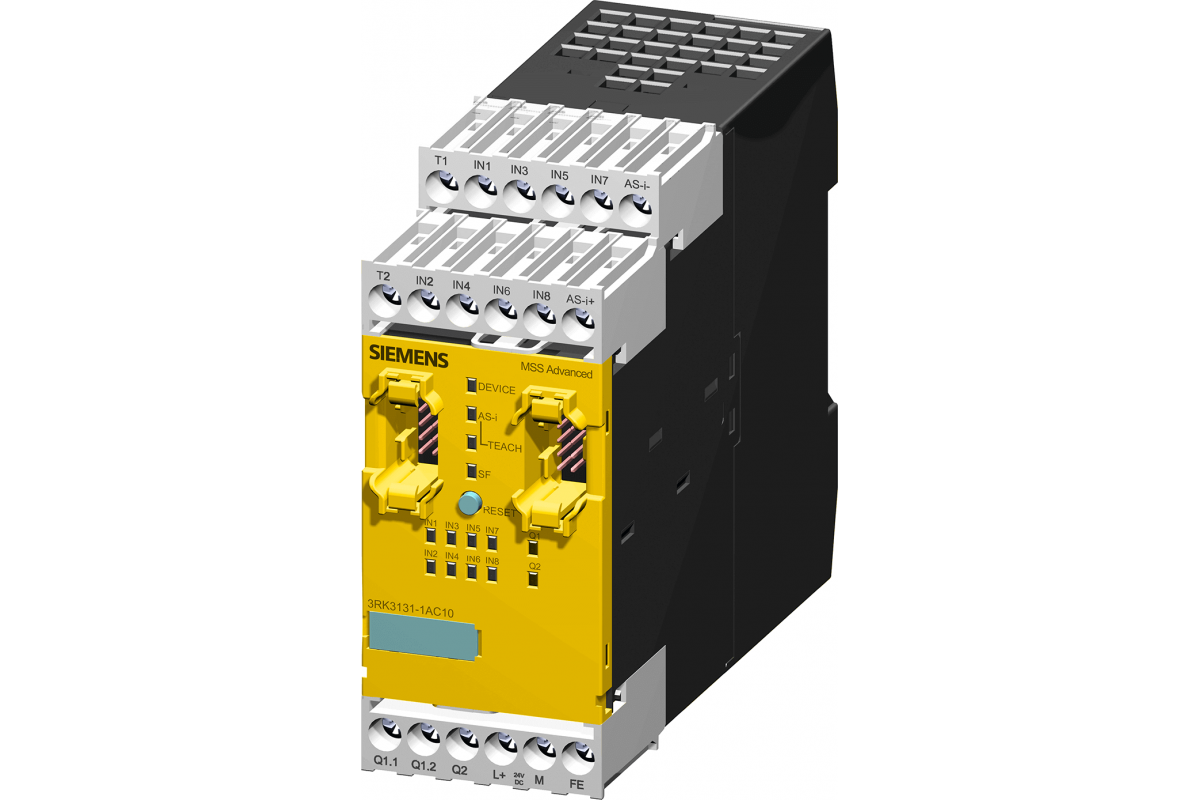 SIRIUS, CENTRAL MODULE 3RK3 ADVANCED ДЛЯ MODULAR SAFETY SYSTEM 3RK3 4/8 F-DI, 1F-RO, 1 F-DO, 24VDC MONITORS OF ASI SLAVES, CONTROL OF SAFE OUTPUTS ON AS-I BUS PARAMETERIZABLE VIA SW MSS ES WIDTH 45MM SCREW TERMINAL UP TO CATEGORY 4 (EN954-1) UP TO SIL3 (IEC 61508) UP TO PERFORMANCE LEVEL E (ISO 13849-1)