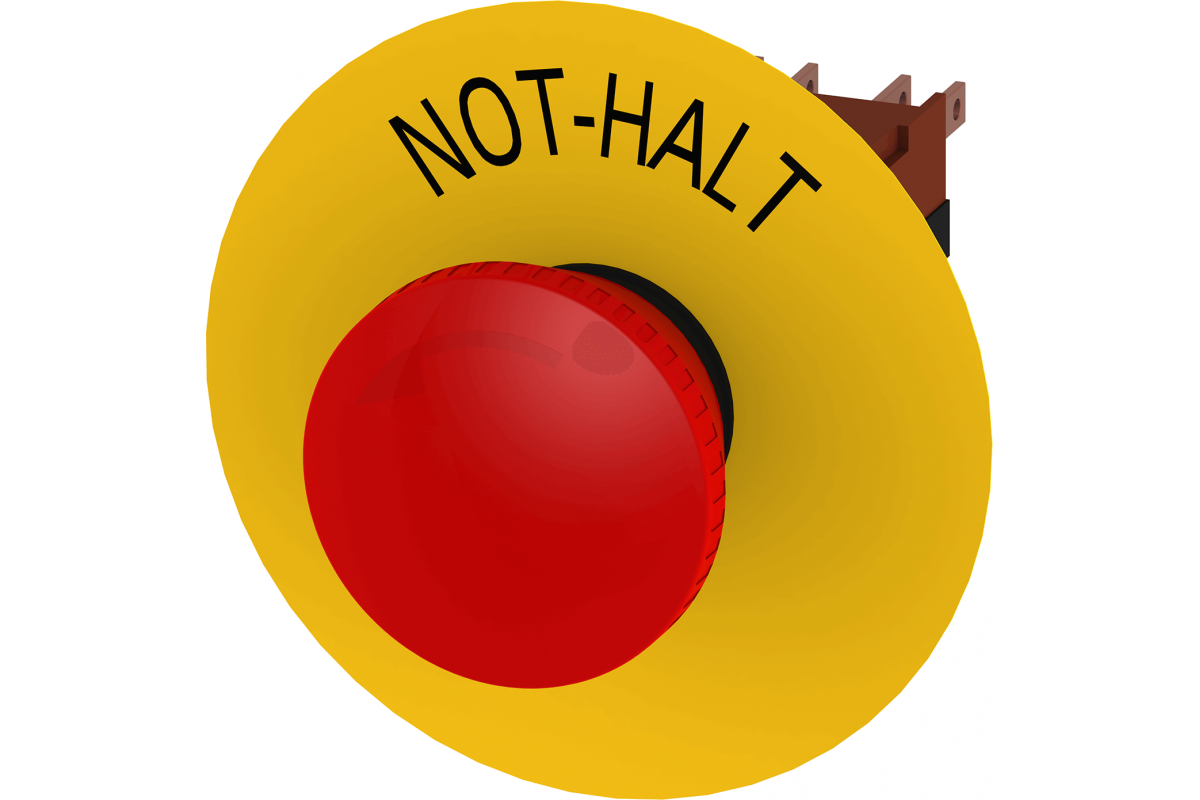 Грибовидная кнопка аварийной остановки, 16 мм, круглая, пластиковая, красная, с фиксацией, с поворотно-откидным механизмом, в соответствии с ISO 13850, 1 НЗ, с желтой опорной пластиной, АВАРИЙНЫЙ СТОП