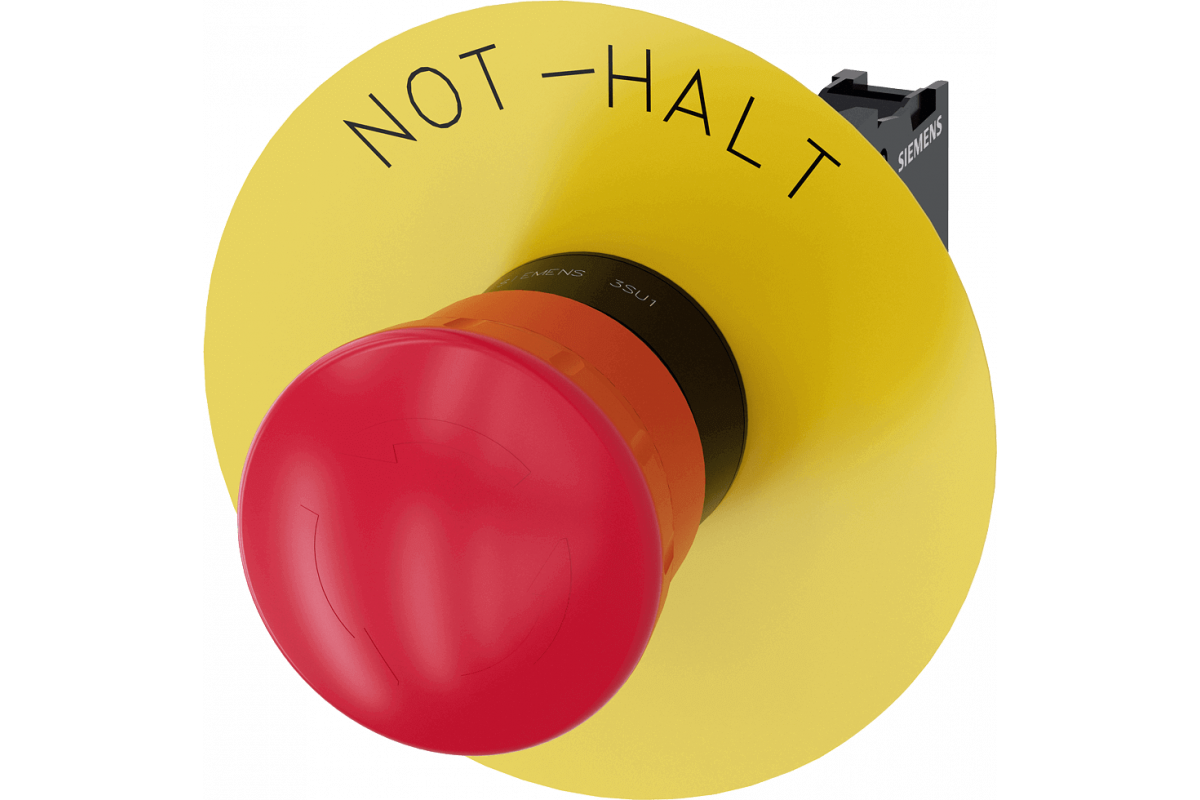 Привод грибовидного типа EMERGENCY STOP, 22 мм, круглый, пластиковый, красный, 40 мм, с принудительной фиксацией, в соответствии с EN ISO 13850, поворотно-откидной, с желтой опорной пластиной, надпись: NOT-HALT, с держателем, 1 НЗ, винтовая клемма