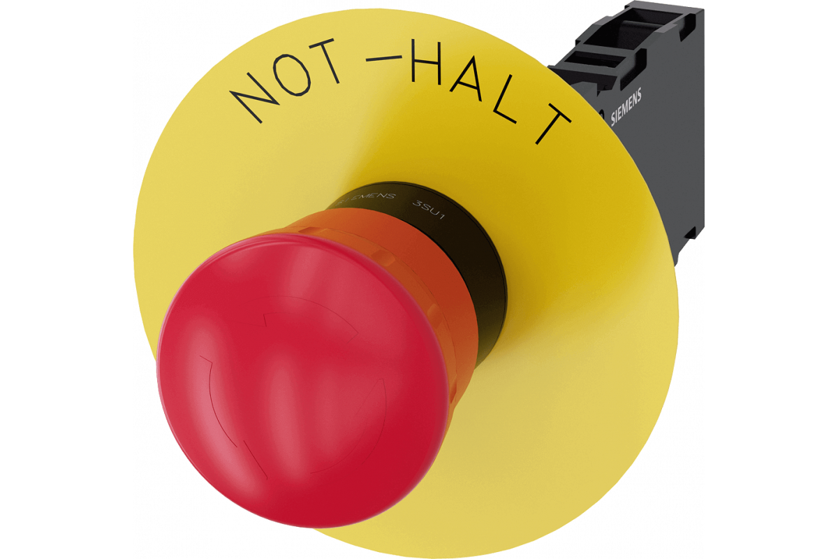Привод аварийного останова грибовидного типа, 22 мм, круглый, пластиковый, красный, 40 мм, с принудительной фиксацией, в соответствии с EN ISO 13850, поворотно-откидной, с желтой опорной пластиной, надпись: NOT-HALT, с держателем, 1 НО+1 НЗ, винтовая клемма