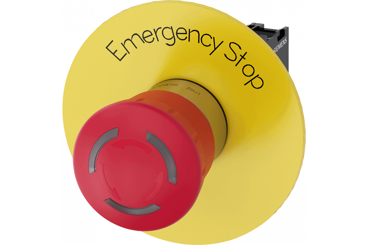 Грибовидная кнопка аварийного останова, с подсветкой, 22 мм, кругл., металл, глянцев., цвет: красный, 40 мм, положительная блокировка, согласно DIN EN ISO 13850, поворотный расцепной механизм, с желтой шайбой, Надпись: Emergency stop, с держателем, 1 НЗ, 1 НЗ, светодиодный модуль со встроенным светодиодом, 24–240 В AC/DC, цвет: красный, винтовой зажим