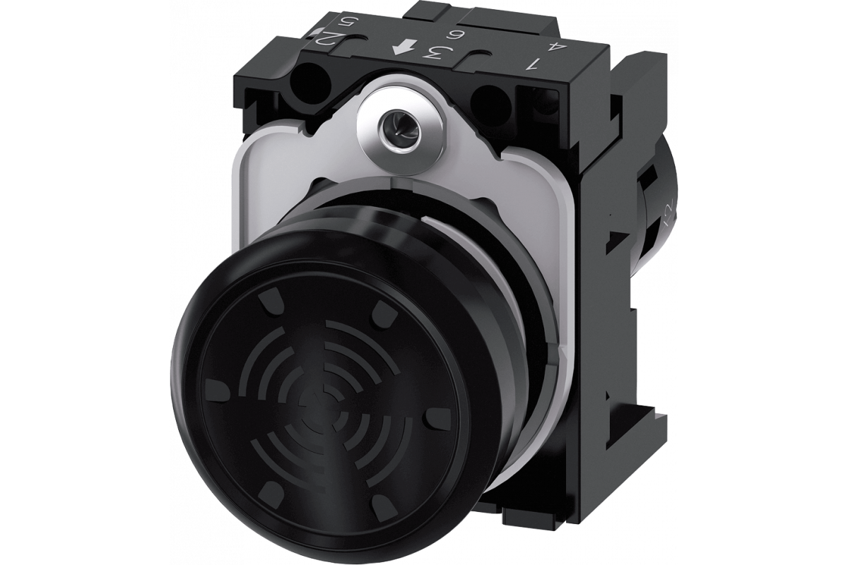 звуковой сигнализатор, компактный, 22 мм, круглый, пластик, черный, непрерывный тон 4.5 кГц, IP69, звуковое давление 75+/-10% дБ/10 см, с держателем, рабочее напряжение 24 В AC/DC, винтовая клемма