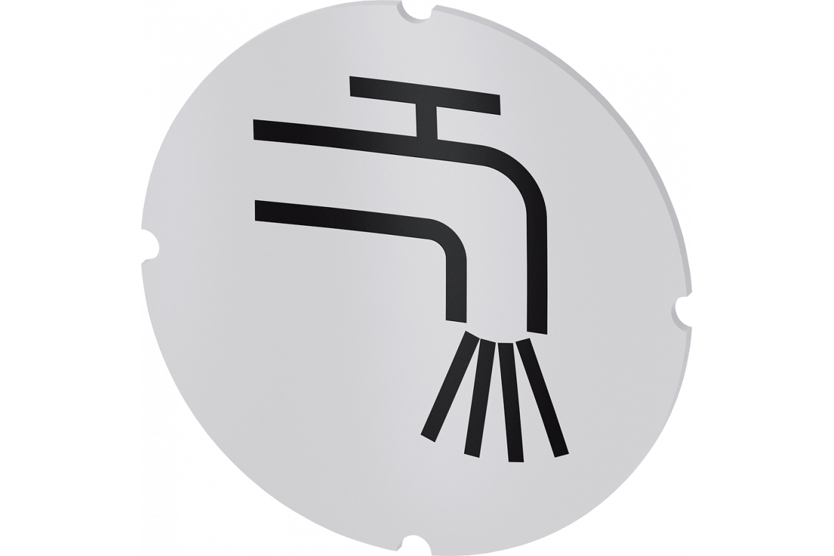 Надпись на подсвечиваемой кнопке, круглая, молочного цвета с черным шрифтом, с графическим символом: водопроводный кран