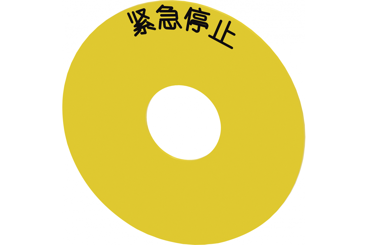 Опорная пластина круглая, для грибовидного привода EMERGENCY STOP, желтая, самоклеющаяся, внешний диаметр 75 мм, внутренний диаметр 23 мм, с надписью: EMERGENCY STOP на китайском языке
