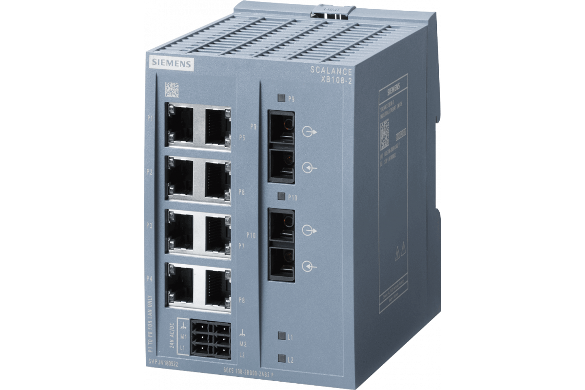 SCALANCE XB108-2 неуправляемый коммутатор IE, 8 портов 10/100 Мбит/с, 2x многомодовых SC 100 Мбит/с, для создания небольших топологий звезда и линия; светодиодная диагностика, IP20, резервный источник питания, 24 В AC/DC Руководство доступно для скачивания .