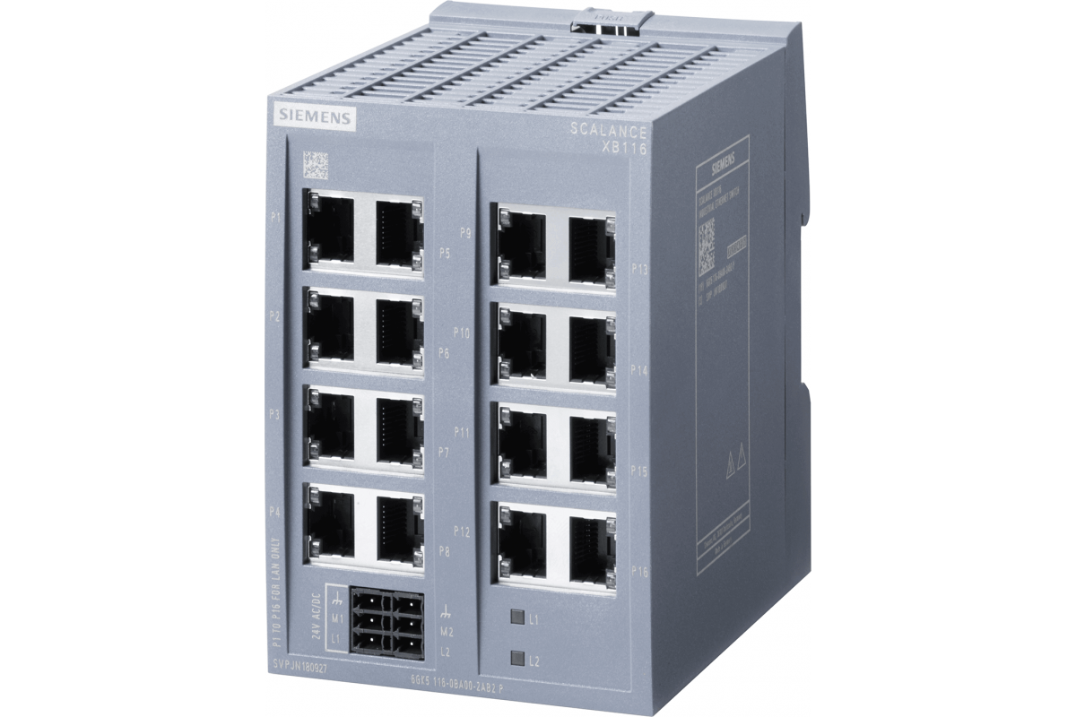 SCALANCE XB116 промышленный неуправляемый коммутатор Industrial Ethernet, 16x электрических RJ45 портов 10/100 Мбит/с; для создания небольших сетей с топологией звеза или шина; светодиодная индикация, IP20, резервированное питание 24В, 24 В AC/DC, электронное руководство доступно для загрузки.