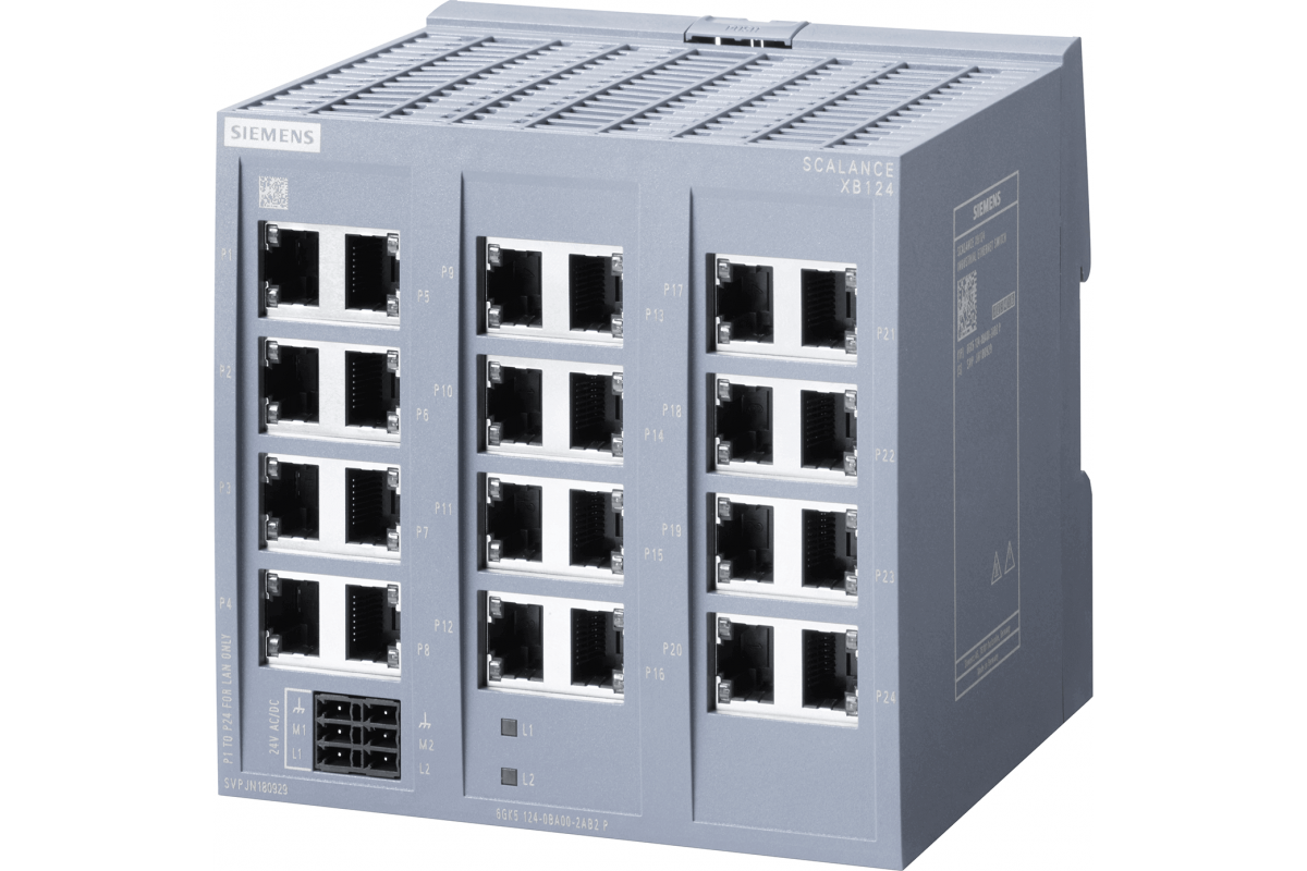 SCALANCE XB124 промышленный неуправляемый коммутатор Industrial Ethernet, 24x электрических RJ45 порта 10/100 Мбит/с; для создания небольших сетей с топологией звеза или шина; светодиодная индикация, IP20, резервированное питание 24 В AC/DC, электронное руководство доступно для загрузки.