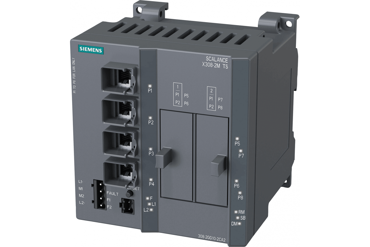 SCALANCE X308-2M TS промышленный управляемый IE коммутатор, компактный; 4х электрических RJ45 порта 10/100/1000 Мбит/с; 2x слота для 2х-портовых медиа-модулей (электрических или оптических) 100/1000 Мбит/с; светодиодная индикация; диагностический выход, PROFINET IO-устройство; управление сетью; встроенный redundancy manager; офисные функции (RSTP, VLAN, IGMP, ..); C-plug модуль в комплекте поставки, расширенный температурный диапазон, соответсвие ж.д. стандартам EN 50155