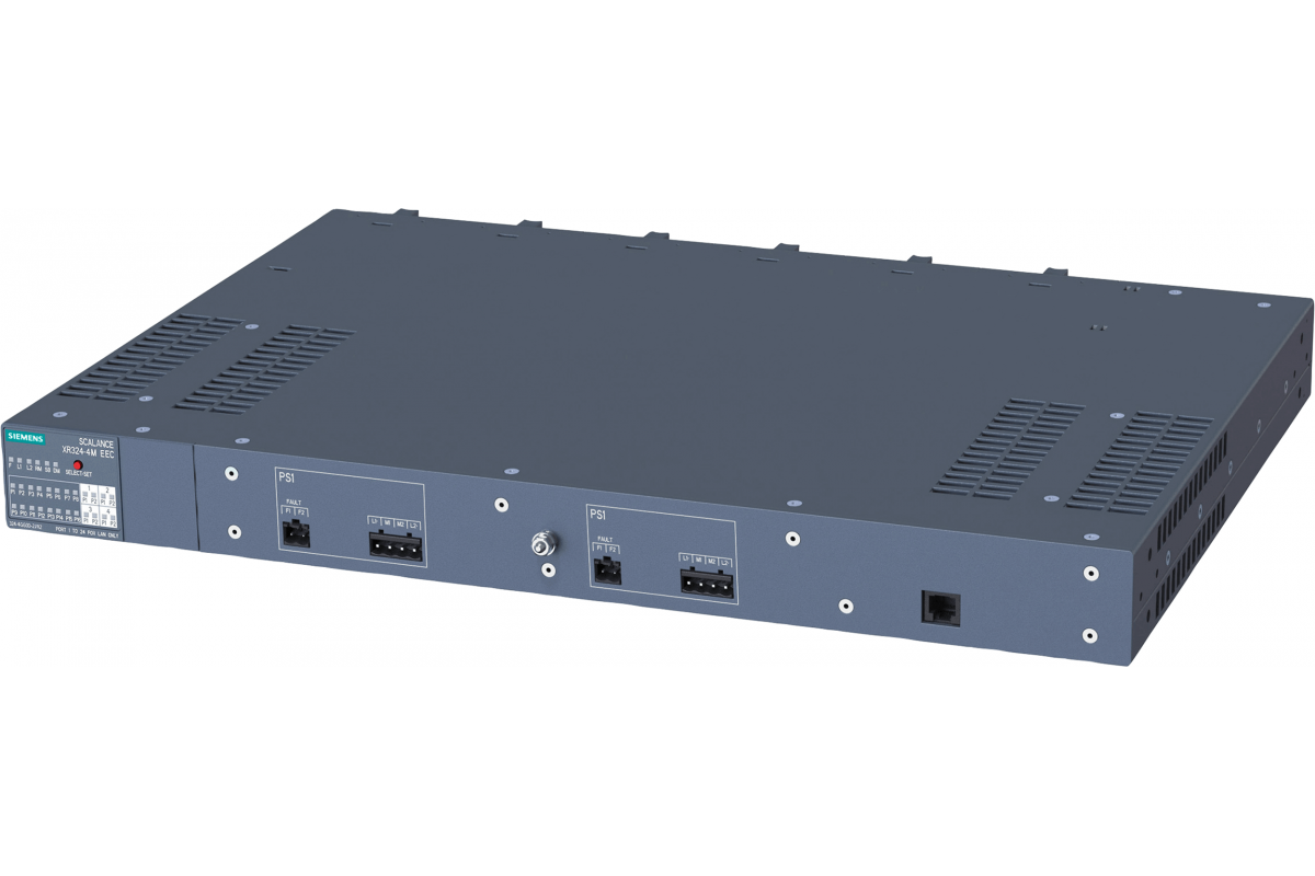 SCALANCE XR324-4M EEC промышленный управляемый IE коммутатор, монтаж в 19" стойку; 16x электрических RJ45 портов 10/100/1000 Мбит/с; 4x слота для 2х-портовых медиа-модулей (электрических или оптических) 100/1000 Мбит/с, светодиодная индикация, диагностический выход; кнопка управления, PROFINET IO-устройство, управление сетью, встроенный redundancy manager; питание 2 входа 24 В постоянного тока; порты на задней панели.