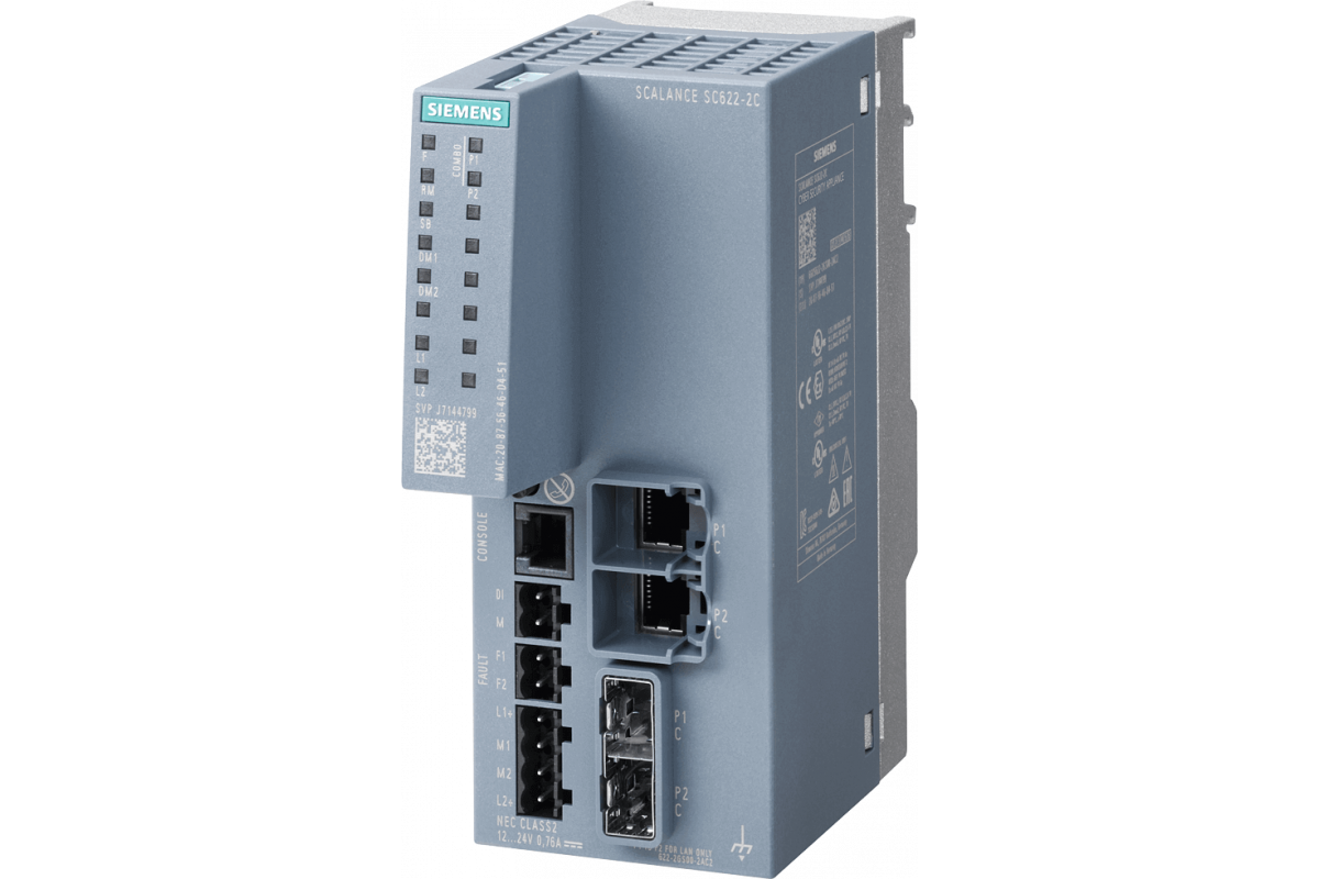 SCALANCE SC622-2C промышленное устройство кибербезопасности; Для защиты оборудования и сетей в непрерывных и дискретных производствах; Функции межсетевого экрана, трансляция адресов (NAT/NAPT), подключение к SINEMA RC; 2 комбинированных порта 1000 Мбит/c (может быть использован либо SFP-модуль 1000 Мбит/c либо электрический RJ45 порт 10/100/1000 Мбит/c)