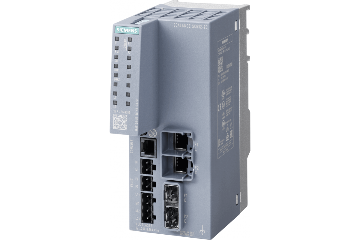 SCALANCE SC632-2C промышленное устройство кибербезопасности; Для защиты оборудования и сетей в непрерывных и дискретных производствах; Функции межсетевого экрана, трансляция адресов (NAT/NAPT), подключение к SINEMA RC; 2 комбинированных порта 1000 Мбит/c (может быть использован либо SFP-модуль 1000 Мбит/c либо электрический RJ45 порт 10/100/1000 Мбит/c)