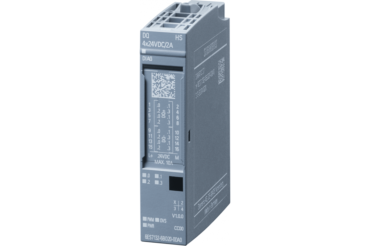 Simatic ET 200Sp, модуль дискретного вывода, dq 4x= 24 в/2a high speed, В упаковке: 1 шт., для установки на базовый блок a0, цветовой код cc00, три альтернативных режима работы: дискретные выходы, передискретизация, шим, диагностика модуля
