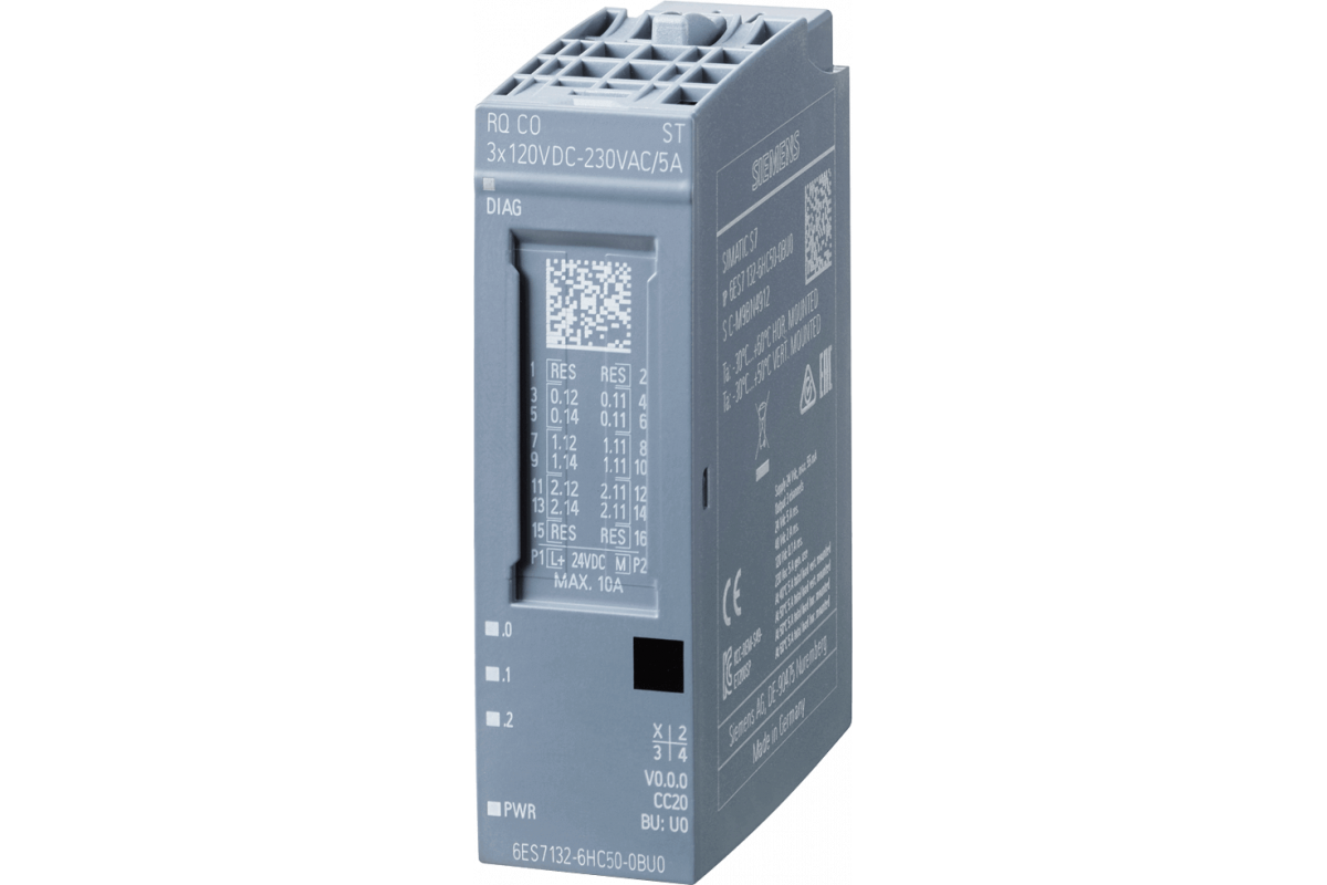 SIMATIC ET 200SP, модуль релейных выходов, RQ CO 3x 120V DC..230VAC/5A ST, 3 перекидных контакта (CO), изолированные контакты, упаковка из 1 шт., для установки на базовые блоки типа U0, цветовой код CC20, замещающее значение, диагностика модуля для напряжения питания