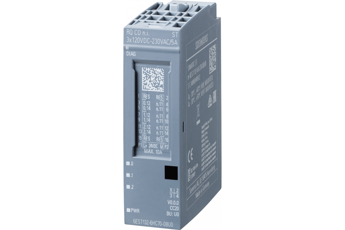 SIMATIC ET 200SP, модуль релейных выходов, RQ COni 3x120VDC..230VAC/5A ST, 3 перекидных контакта (CO), неизолированные контакты, упаковка из 1 шт., для установки на базовые блоки типа U0, цветовой код CC20, замещающее значение, диагностика модуля для напряжения питания