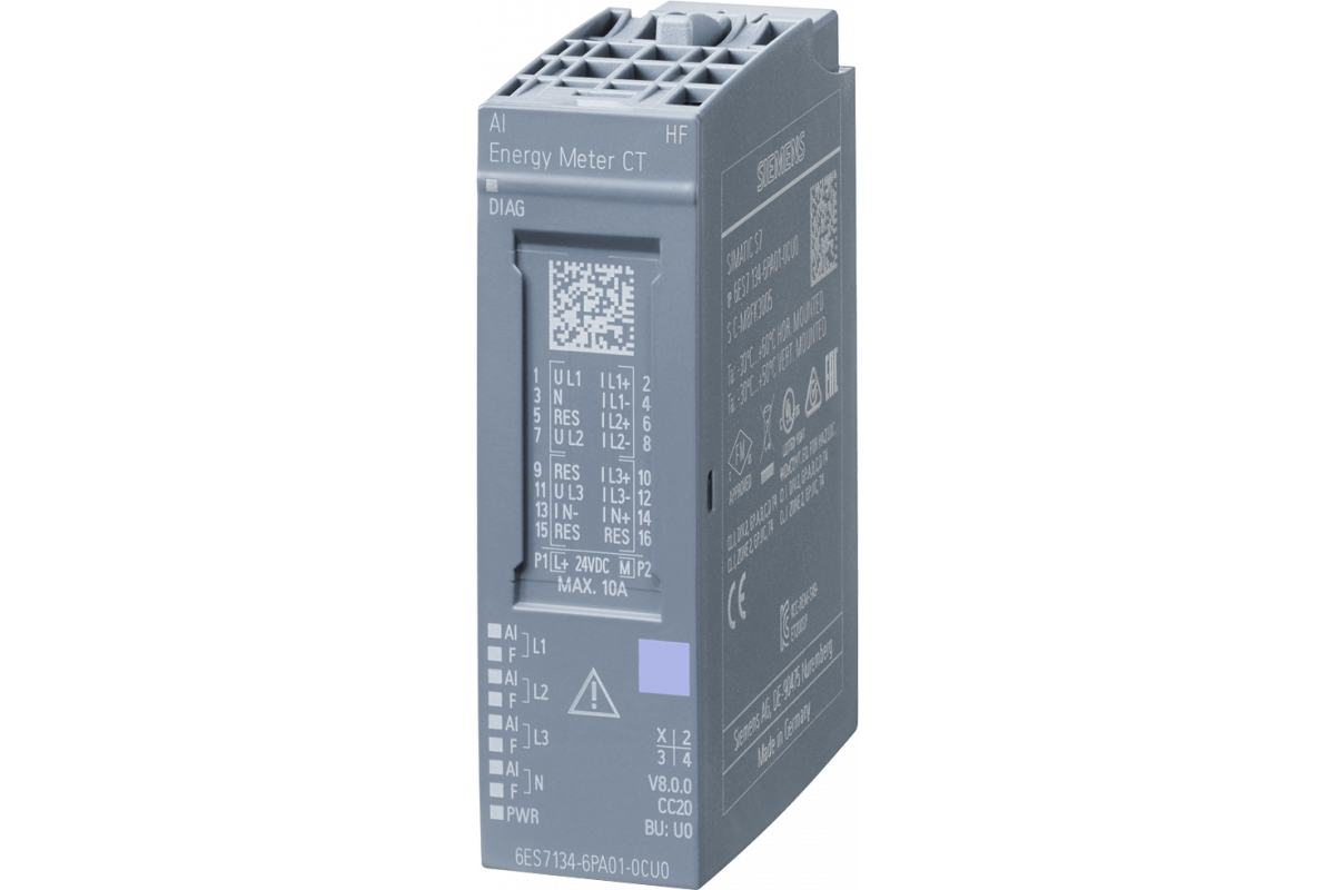 SIMATIC ET 200SP, модуль аналогового ввода - электрический счётчик ~480 В, AI Energy Meter 480V CT HF, с улучшенными функциями, для токовых трансформаторов 1A/5A, с функциями анализа сети, для установки на базовый блок типа U0, диагностика канала