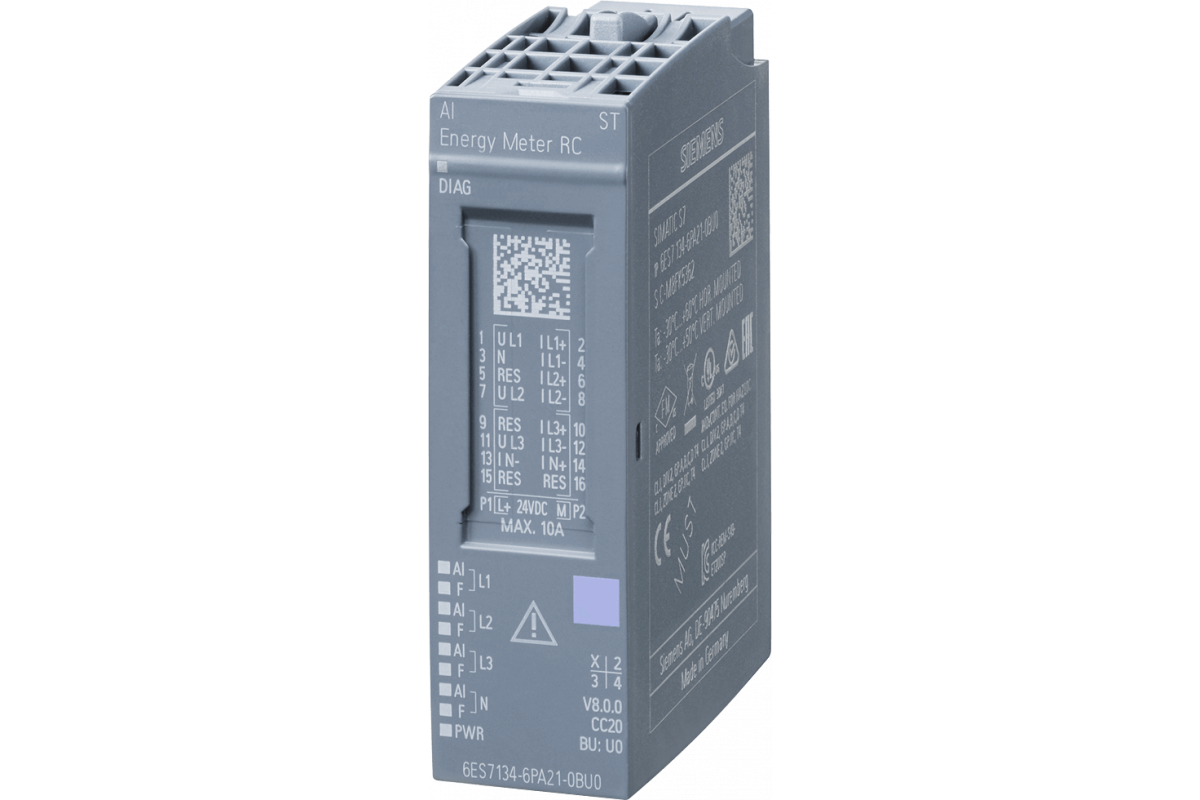 SIMATIC ET 200SP, модуль аналогового ввода - электрический счётчик ~480 В, AI Energy Meter 480V RC ST, со стандартными функциями, для катушек Роговского, трансформаторов тока/напряжения 333 мВ, для установки на базовый блок типа U0, диагностика канала
